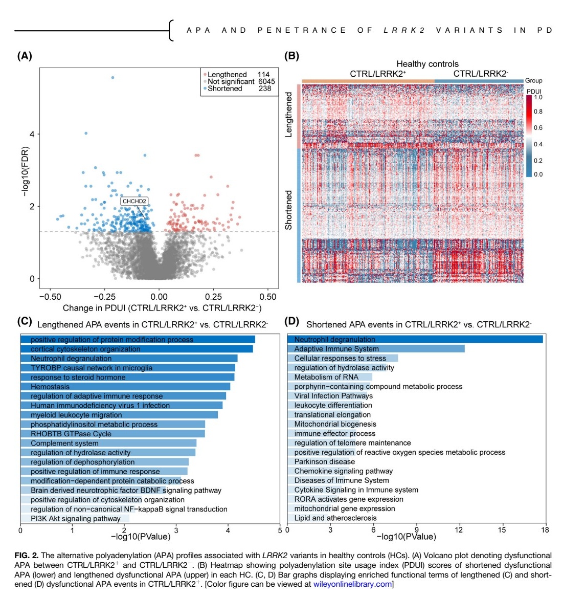- 主要发现: LRRK2变异相关异常APA事件增加:PD患者LRRK2变异相关异常APA事件超健康对照两倍,涉及免疫紊乱等与PD发病机制相关通路,表明该变异可能通过异常APA加剧PD分子脆弱性。