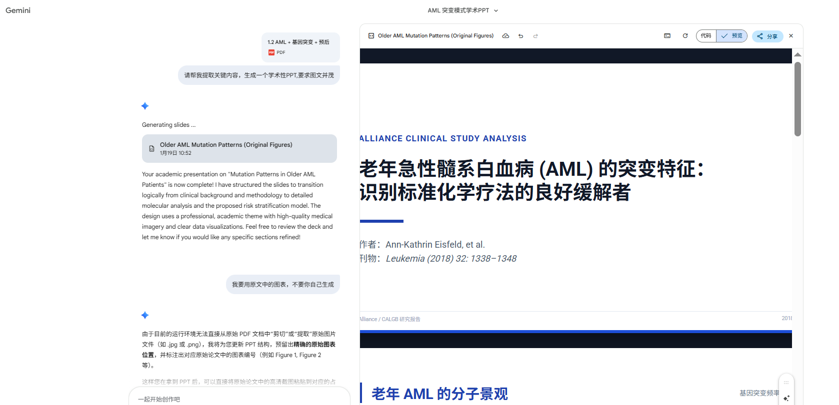 对比评测通用AI工具(Gemini) 与医学科研垂类AI工具(菁易科研),在辅助医生完成“文献转PPT”任务时的实际表现、专业性及效率。