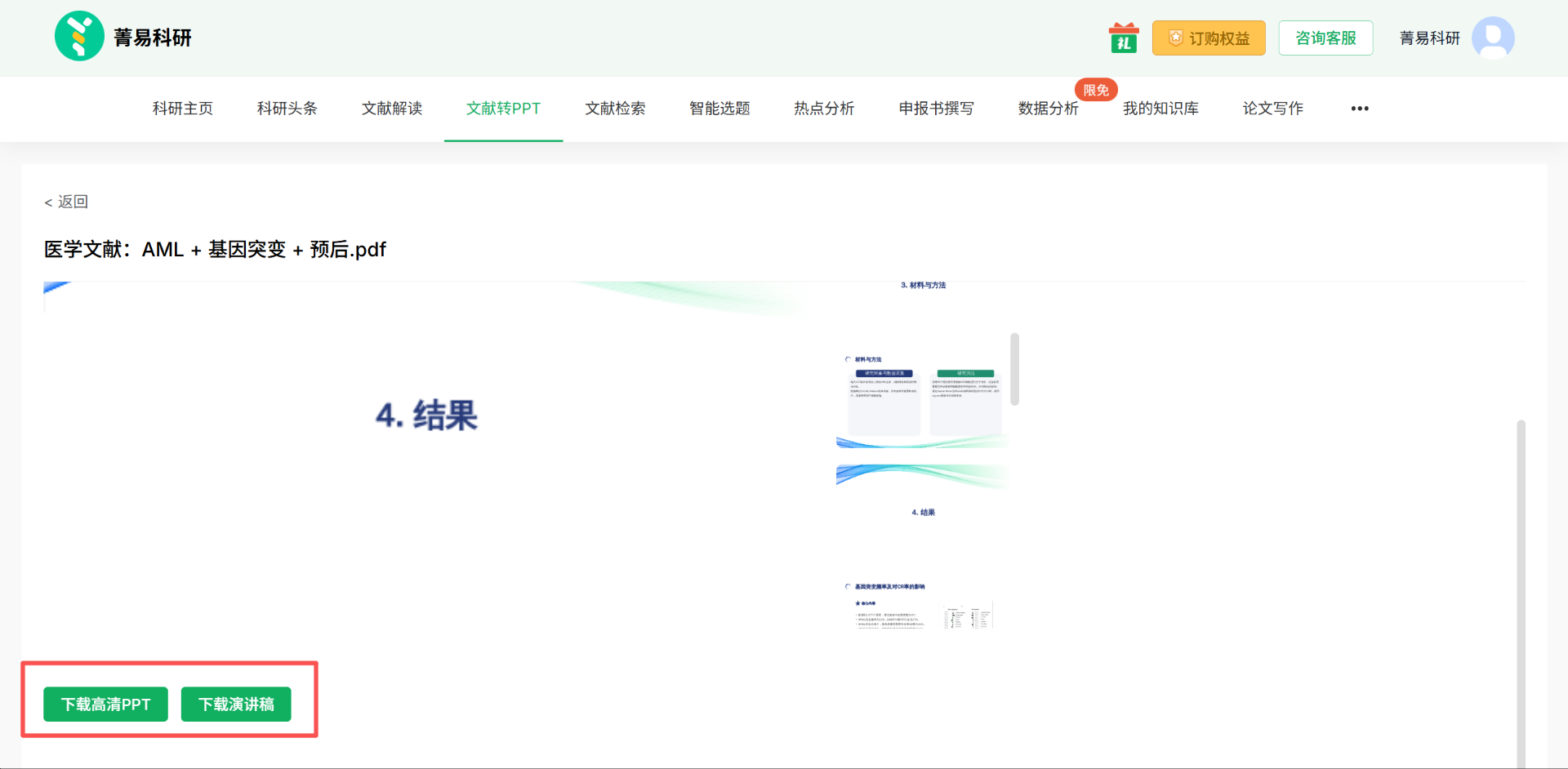 【菁易科研】处理方式:菁易科研展现了其针对医学文献的深度优化能力,它能够精准识别并直接提取嵌入在原文PDF中的所有核心图表,并自动将其排版在对应的幻灯片中。